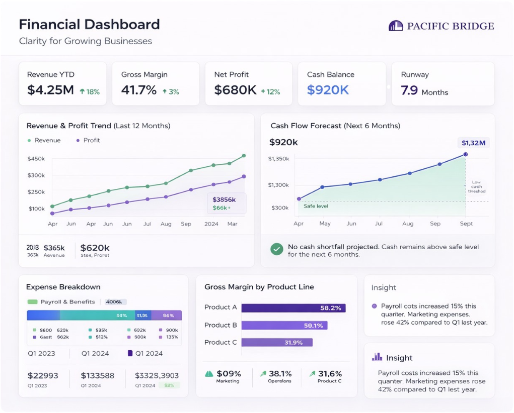 Pacific Bridge enables growing businesses to scale without the cost and operational burden of building in-house finance teams. We provide experienced financial leadership and timely insights, giving owners the clarity to make better strategic decisions.
